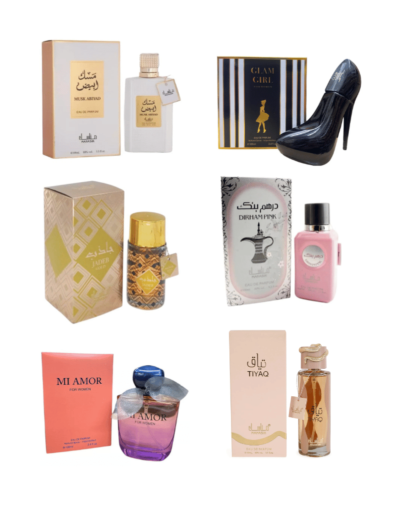 Musk Abiyad, Glam Girl, Jadeb Gold, Dirham Pink, Eclat, Mi Amor, Tiyaq