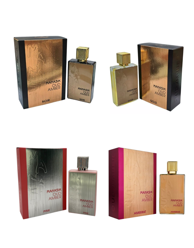 Oud Amber Gold Manasik opens with vibrant bergamot, saffron, and pink pepper before revealing a heart of rose and oud, resting on a warm base of sandalwood, musk, vanilla, and patchouli. Oud Amber Noir Manasik takes on a bolder personality, with bright bergamot and grapefruit balanced by black pepper, leading into an intense oud and amber heart, finished with earthy woods and creamy vanilla. Oud Amber Ameerat Manasik offers a regal composition, weaving saffron, bergamot, and cardamom into a captivating blend of oud, jasmine, and amber, before settling into a smooth base of sandalwood, musk, and patchouli. Completing the collection, Oud Amber Pink Fragrance Couture presents a modern, feminine twist, with fruity raspberry and bergamot opening into a floral heart of rose, jasmine, and oud, enveloped by the warmth of amber, vanilla, and soft woods.